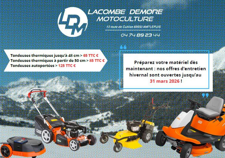 Copyright Lacombe Demore Motoculture 2025 - Tous droits réservés - Mentions légales - Crédits photos - Site réalisé par Web Digit'Alpes.